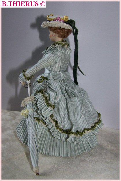 Cette jeune femme s'apprête pour une promenade au parc Monceau. J'ai créé tout le décor. Table de toilette , fauteuil et miroir ... Seul le porte-chapeau et une petite soucoupe en porcelaine sont des achats.