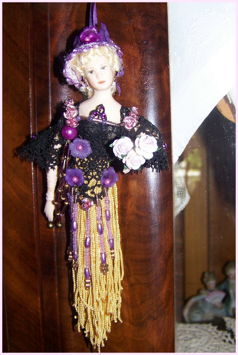 J'avais des perles nacrées mais j'ai dû retrouver quelques fleurs de lucites supplémentaires. Je les ai vêtues avec du fil de passementerie or, de dentelles pour le bustier et je leur ai créé un chapeau de paille. Leurs bijoux sont en swaroski. Je les ai photographiées sur la clé de l'armoire à dentelles des femmes , seules puis devant deux anciennes bourses de bal en tapisserie du début du siècle dernier.